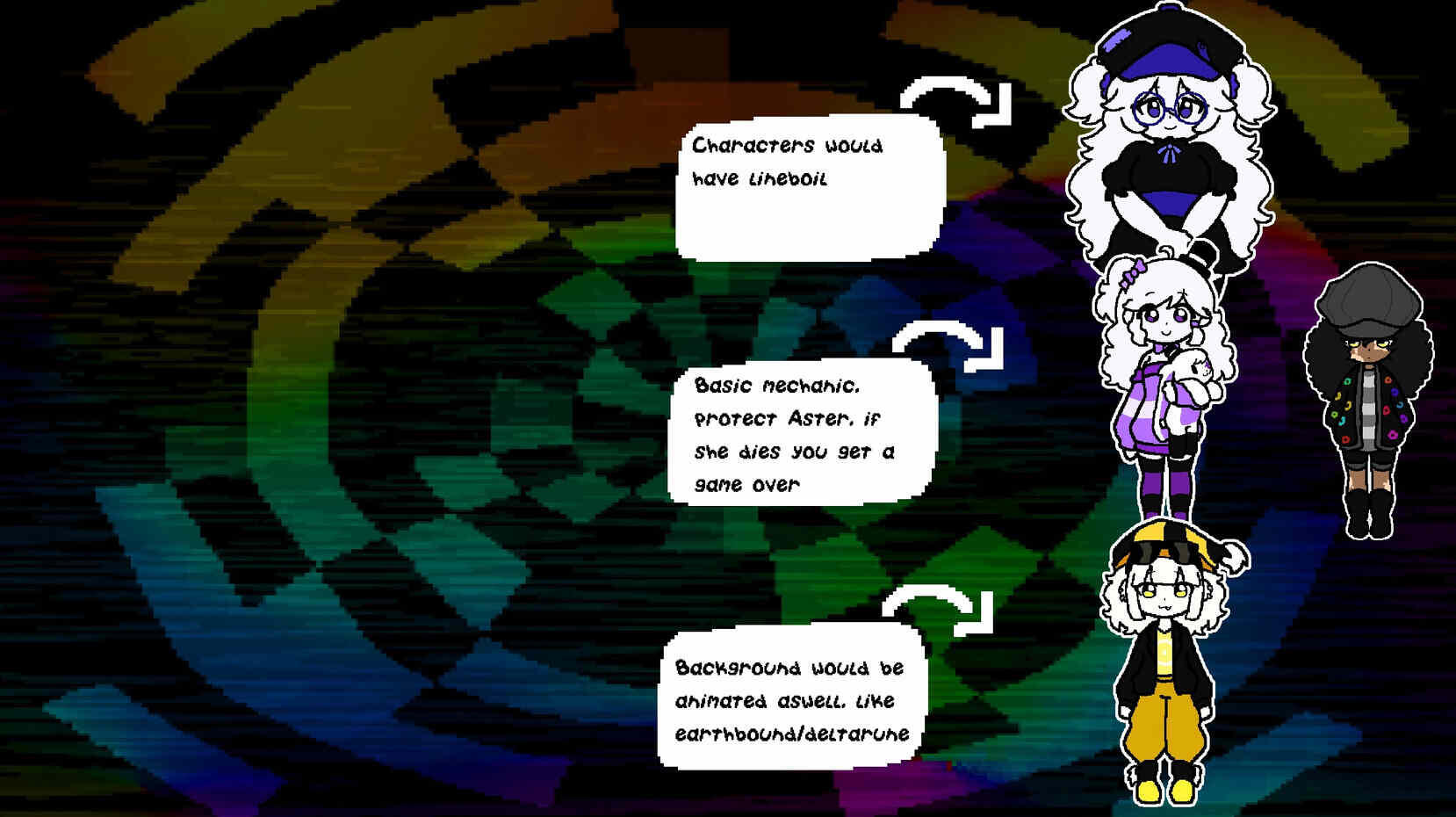 This website is dedicated to"FLORIBIS COMPLEX"The story is a tribute to early internet nostalgia, and takes place around late 2000s - early 2010s."Aster Hawthorne", the main protagonist of the story, after waking up in a unfamiliar world on the brink of collapse, Aster must reluctantly aid Lavender and her friends as they find the missing pieces of the "EQUINOX", the seal that bound the realms of ORDER & DISORDER apart from our own, and traverse different realities.(all with a distinct art style!)Currently, i am planning to create this project in "RPGMAKER MV", however due to this engines limits, expect possibility of change.